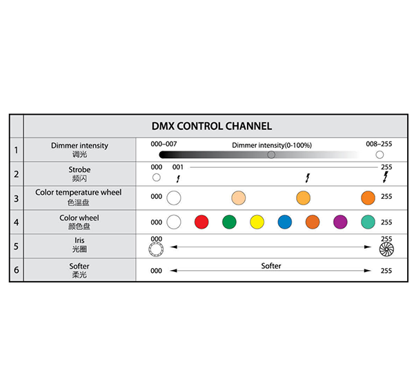 •控制模式:可用随灯控制盒控制,也可外接DMX512信号控制,XLR3PIN或XLR5PIN两种信号插座